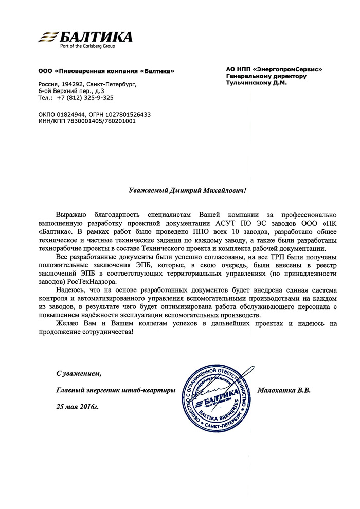 Благодаря применению многоканальных счётчиков электроэнергии SATEC BFM получилось свести баланс электроэнергии по всему предприятию. Персонал фабрики обеспечен своевременной информацией по энергопотреблению на каждом отдельном технологическом участке и всего предприятия в целом. Главный инженер получает данные для анализа расхода электроэнергии, а также осциллограммы, анализ качества и другие параметры электрической сети.